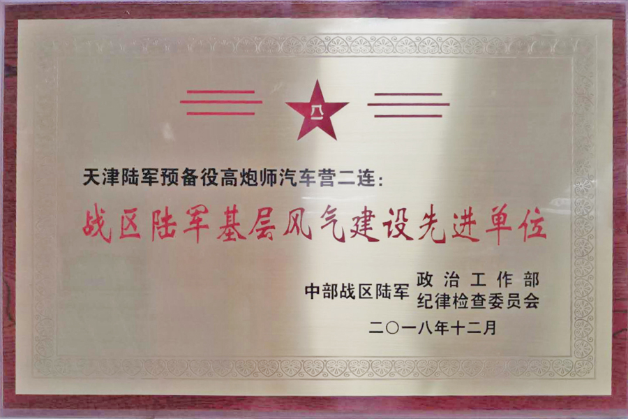 同時(shí),為表彰預備役高炮師汽車(chē)營(yíng)二連日??炭嘤柧?,嚴肅風(fēng)紀,積極承當各項任務(wù)。中部戰區陸軍政治工作部、紀律檢查委員會(huì ),特授予天津陸軍預備役汽車(chē)營(yíng)二連“戰區陸軍基層風(fēng)氣建設先進(jìn)單位”稱(chēng)號。