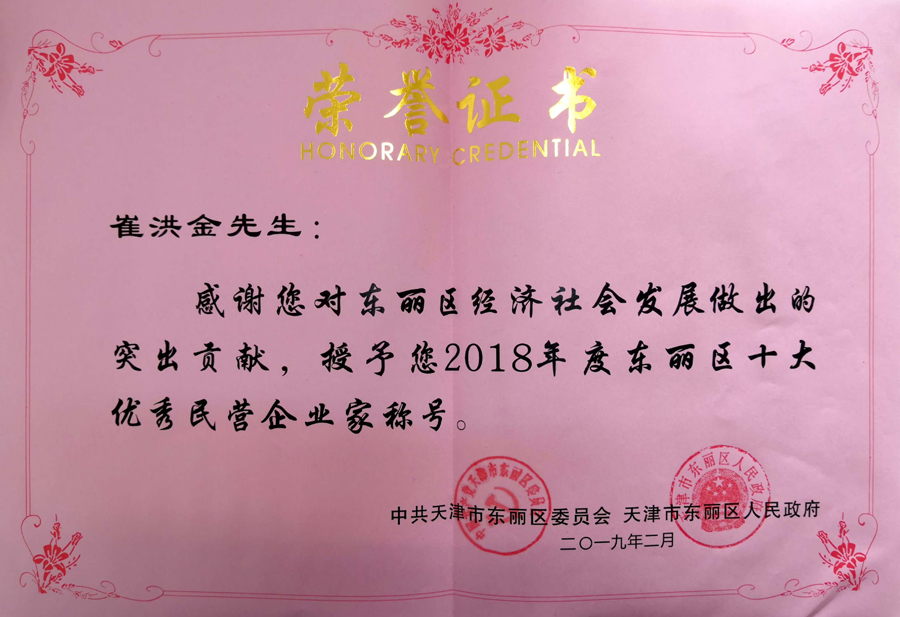 安達集團黨委書(shū)記、董事長(cháng)崔洪金榮獲2018年度東麗區十大優(yōu)秀民營(yíng)企業(yè)家并頒發(fā)證書(shū)。